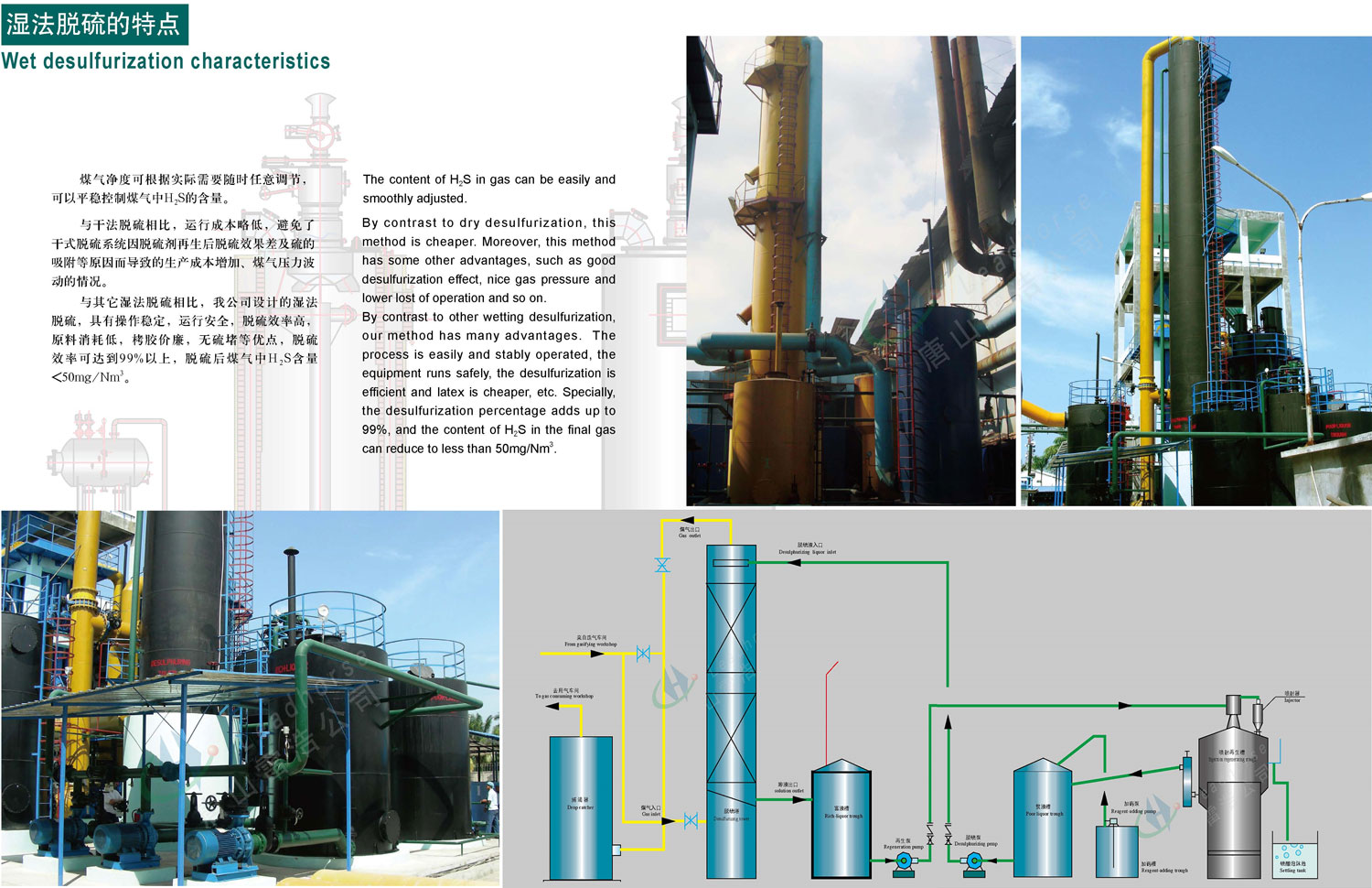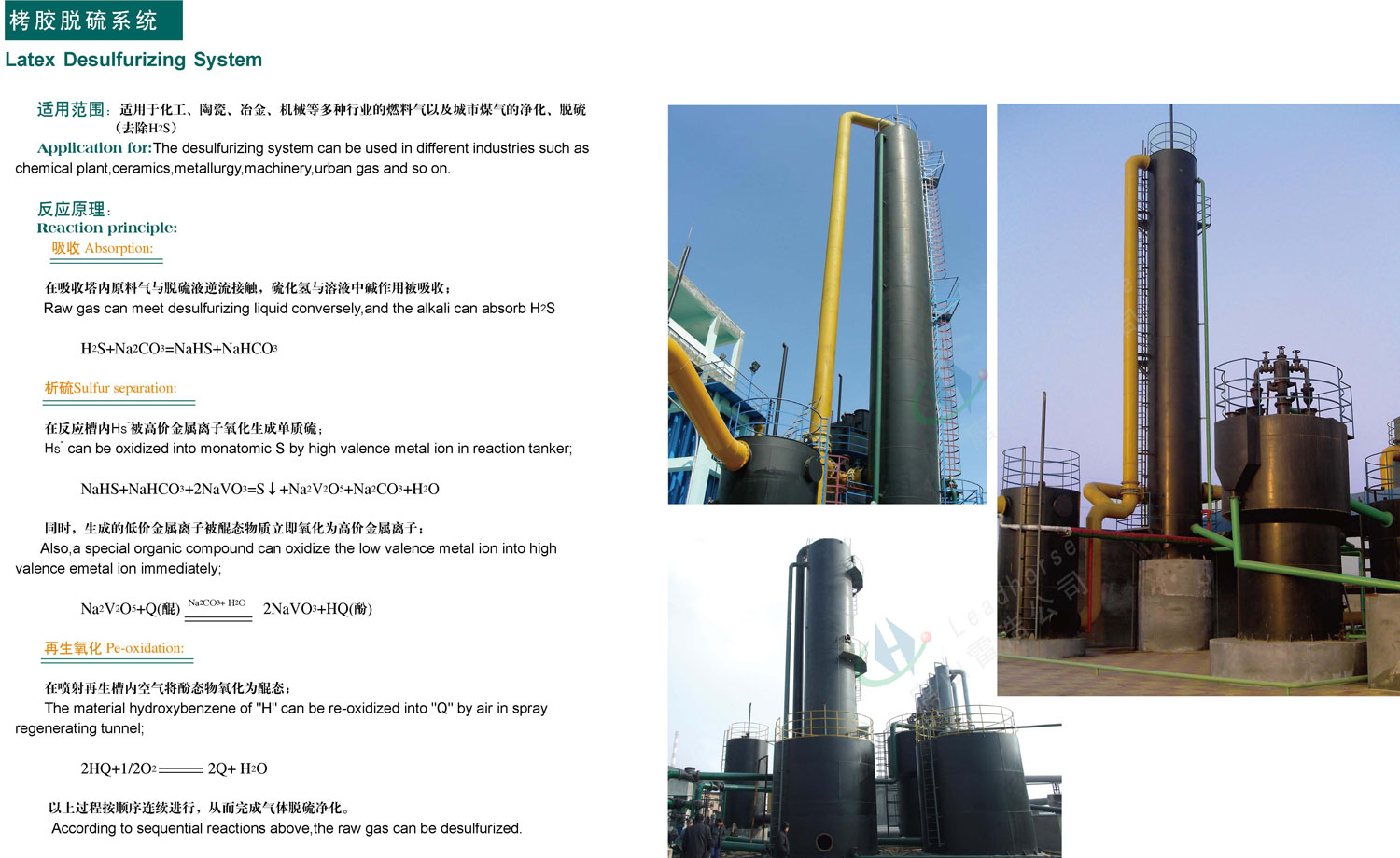 適用范圍:適用于化工、陶瓷、冶金、機(jī)械等多種行業(yè)的燃料氣以及城市煤氣的凈化、脫硫(去除H2S) 反應(yīng)原理:(1)吸收:在吸收塔內(nèi)原料氣與脫硫液逆流接觸,硫化氫與溶液中堿作用被吸收;H2S+Na2CO3=NaHS+NaHCO3 (2)析硫:在反應(yīng)槽內(nèi)Hs被高價(jià)金屬離子氧化成為單質(zhì)硫;NaHS+NaHCO3+2NaVO3=S↓+Na2V2O5+Na2CO3+H2O同時(shí),生成的低價(jià)金屬離子被醌態(tài)物質(zhì)立即氧 化為高價(jià)金屬離子;Na2V2O5+Q(醌)NaCO3+H2O 2NaVO3+HQ(酚) 再生氧化:在噴射再生槽內(nèi)空氣將酚態(tài)物氧化為醌態(tài);2HQ+1/2O2 2Q+H2O 以上為過(guò)程按順序連續(xù)進(jìn)行,從而完成氣體脫硫凈化。